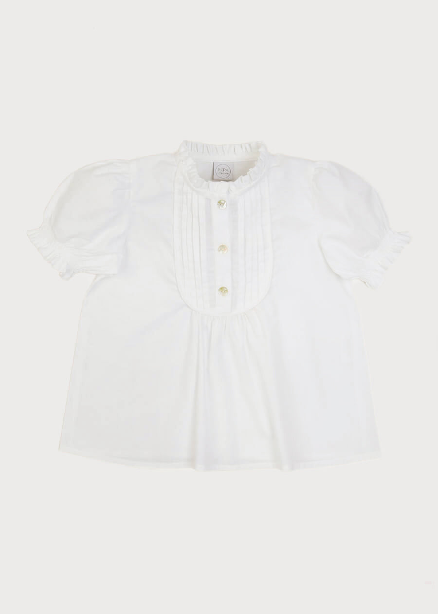 This timeless and traditional design is a perfect piece to build a little girl's outfit with. It has short rouched sleeves and a matching high frilly collar for added detail. It included a statement pleated detail down the front for a finishing touch.