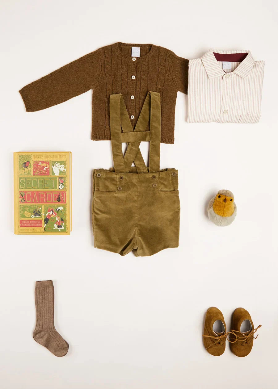 These Velvet Shorts with Braces in Green epitomize lightweight style with a fun, vibrant colour perfect for the new season. Designed for comfort and freedom of movement, they are ideal for active play. The whimsical braces ensure a secure fit, while the velvet material offers a soft, luxurious feel. Stylish and practical, these versatile shorts can be layered under a top for added warmth on cooler days, making them a joyful addition to any wardrobe.
