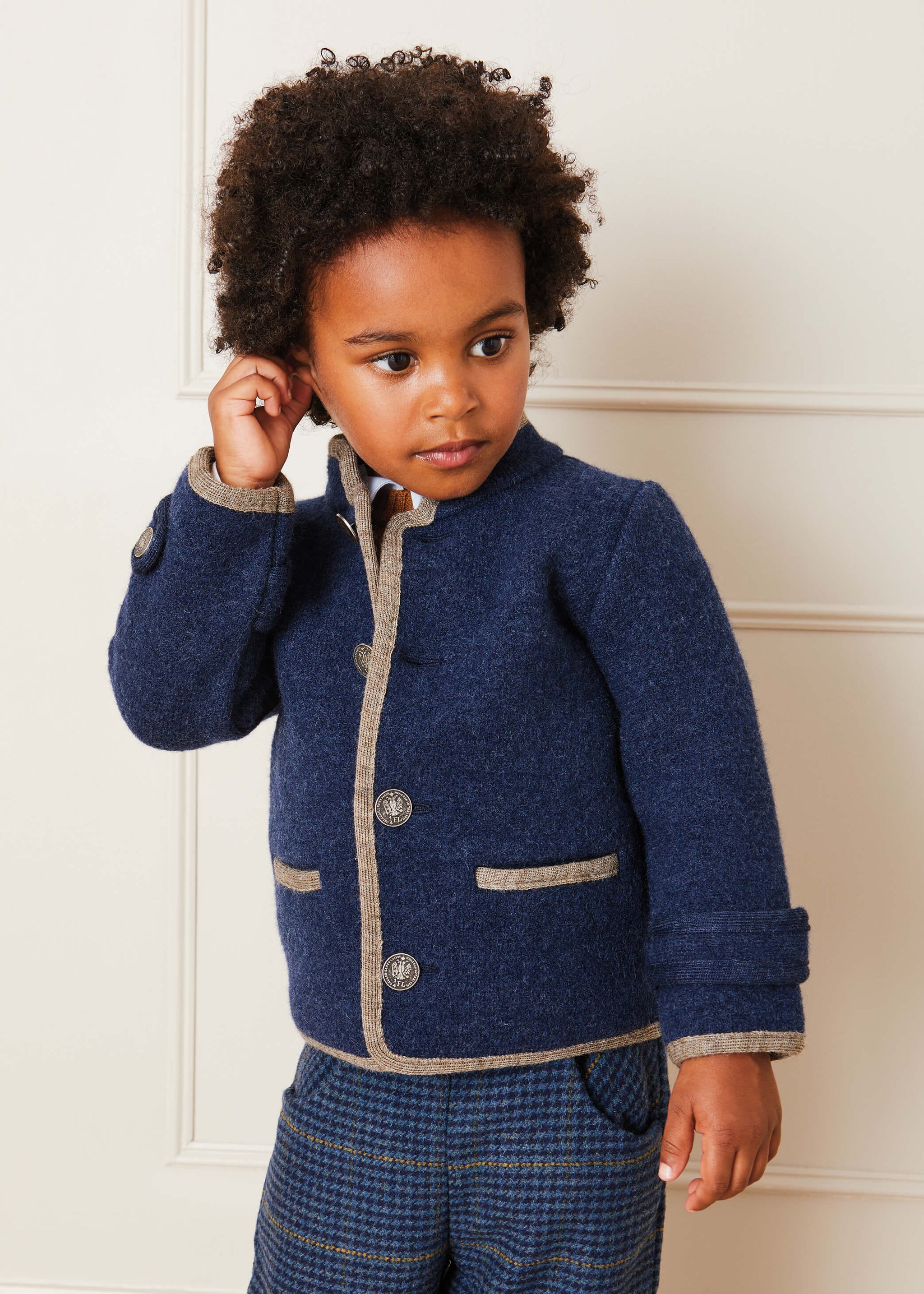 This Classic Blue Austrian Wool Jacket is fully lined and designed to keep your little one warm and cosy during the cooler months. A traditional silhouette, the bold blue jacket features a contrasting beige trim and detailed metal stamp buttons for its single-breasted fastening down the front. It includes two symmetrical functioning pockets with a contrasting trim on the front.