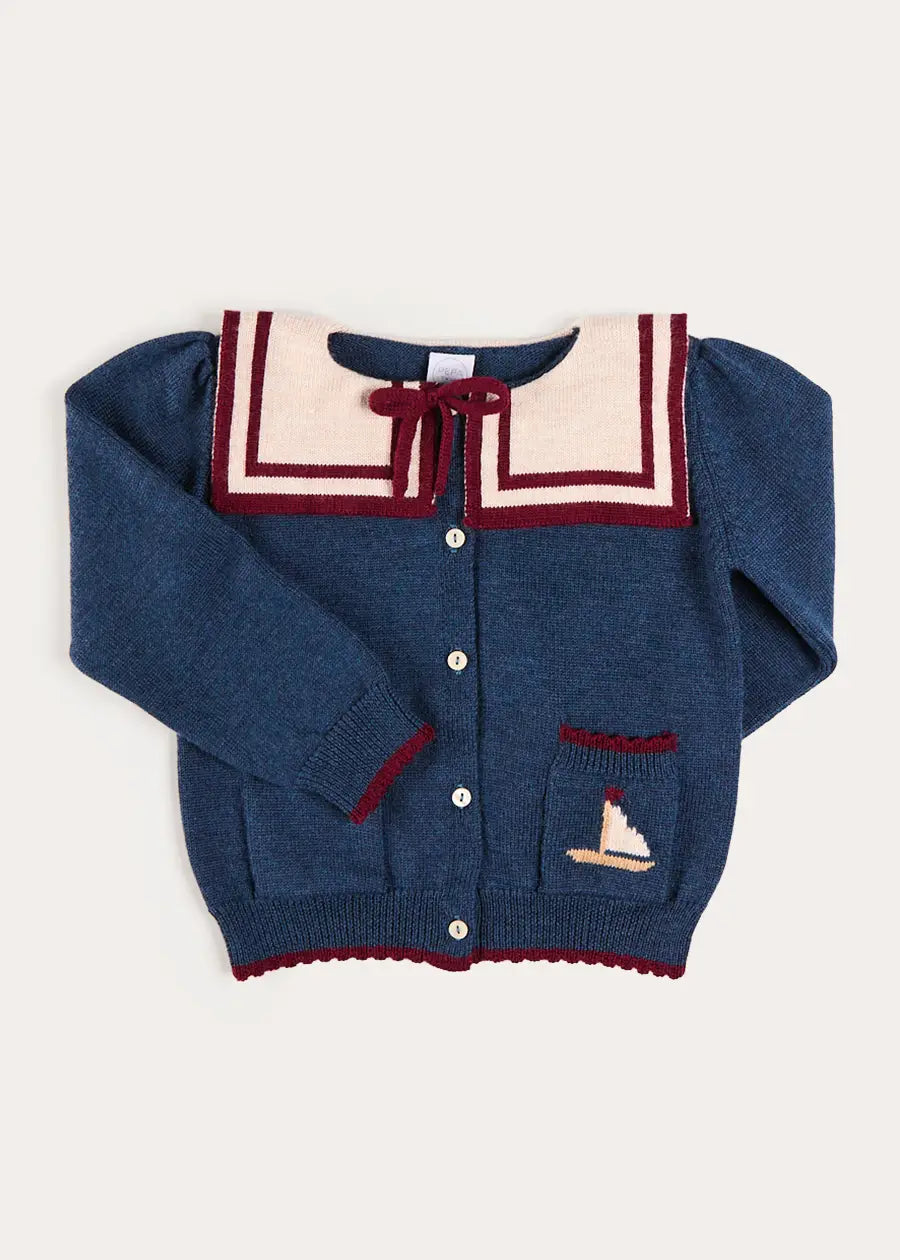 Mariner Collar Jacquard Boat Embroidered Detail Cardigan in Navy (3-10yrs) Knitwear from Pepa London US