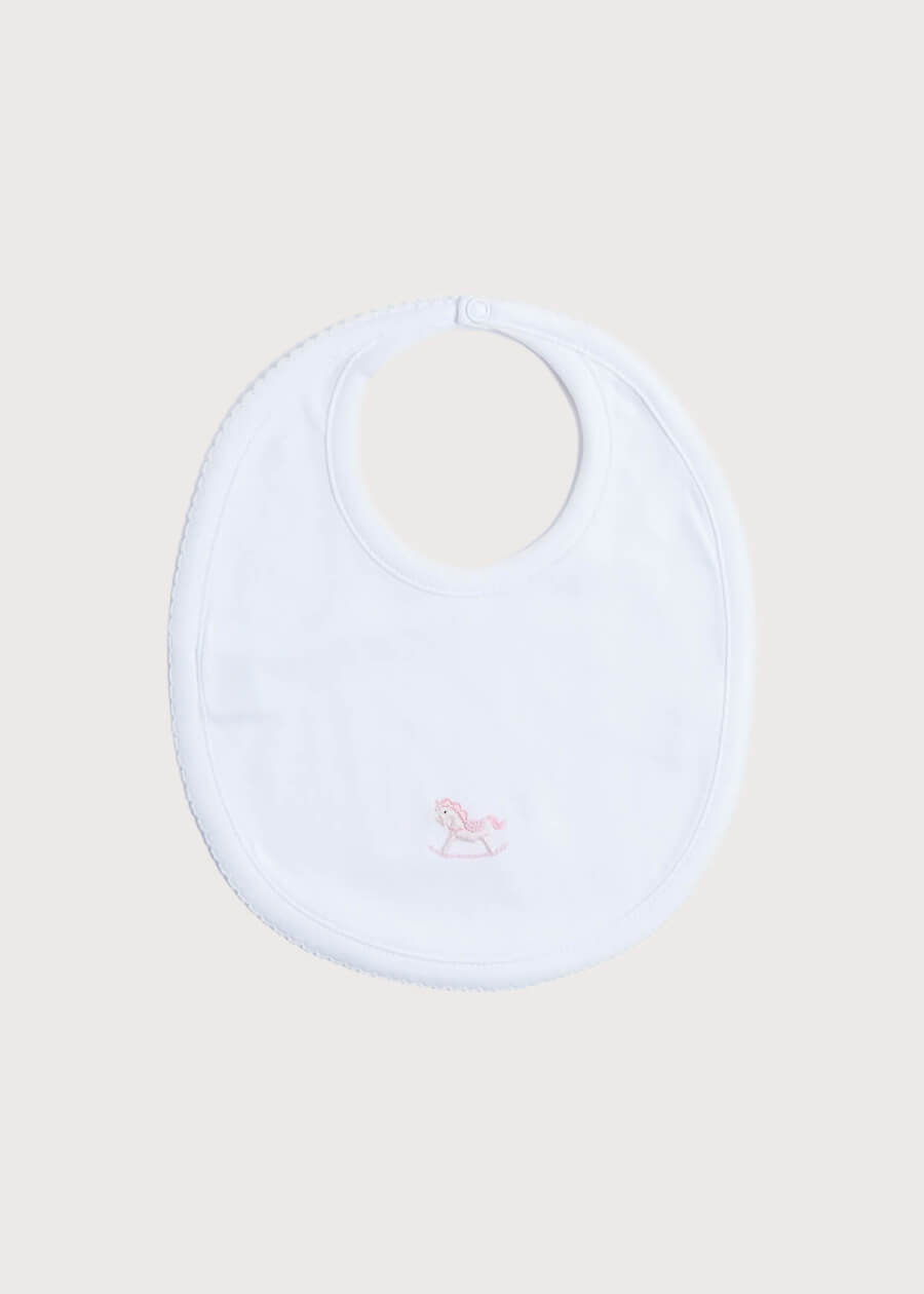 A classic bib with a sweet rocking horse handembroidered on the bottom in pink. Made from the softest cotton, it is ideal for your baby's delicate skin including premature babies. It is also hypoallergenic and extremely resistant to pilling and fading.