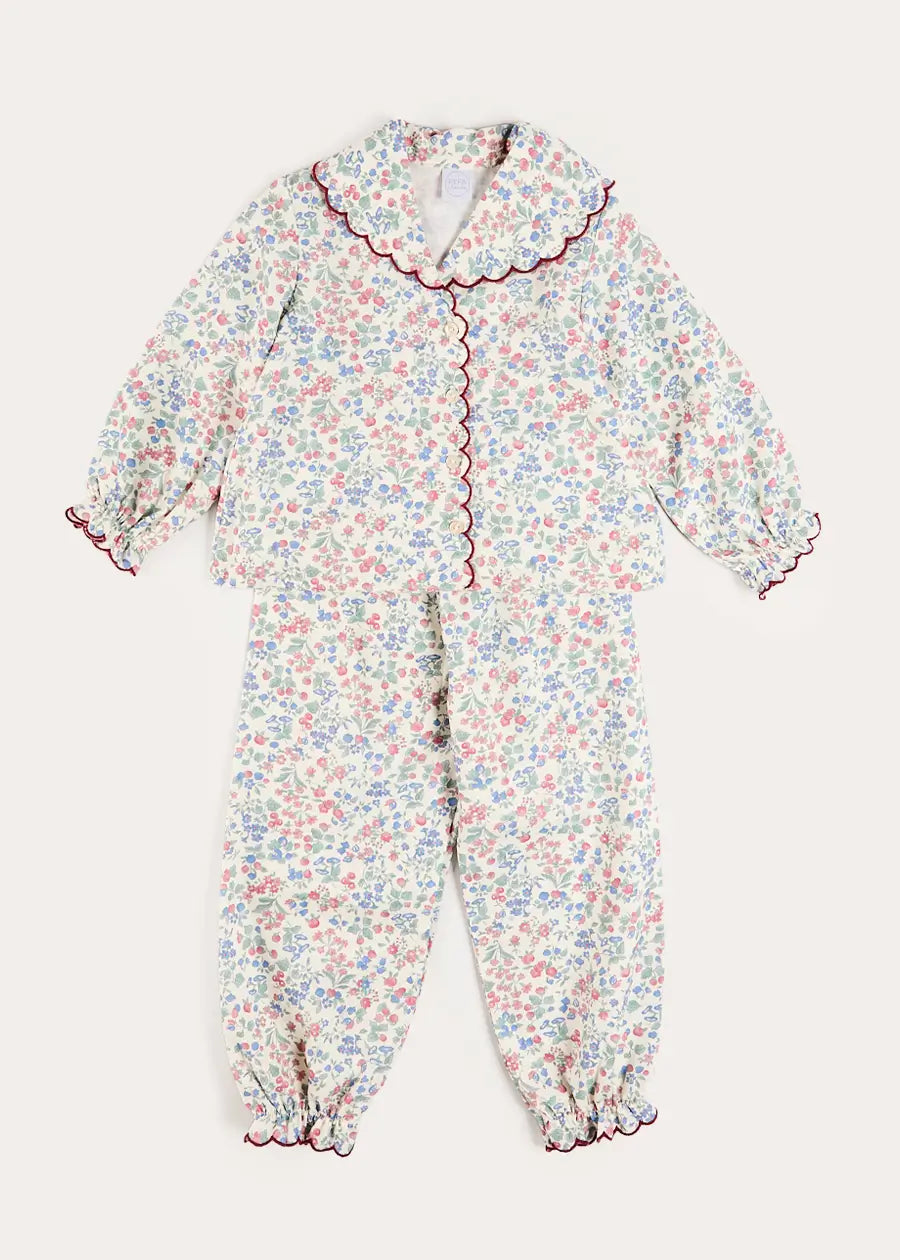 The Rebecca Pyjamas bring a nostalgic charm to bedtime with a bespoke floral print in rich red tones, perfect for cosy autumn evenings. The oversized collar is framed by a delicate scalloped edge with contrast red trim, complemented by frill cuffs on the long sleeves for a timeless finish. Featuring a button-down front for ease, the matching trousers include cuffed bottoms and a soft elasticated waistband with tie detail, offering comfort and a secure fit throughout the night.