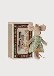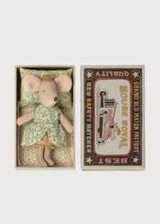 This little Princess Mouse twirls in a printed floral dress and sleeps on a linen bed in her tiny matchbox bed. The perfect pocket companion for hours of fun. Linen bed colour may vary.