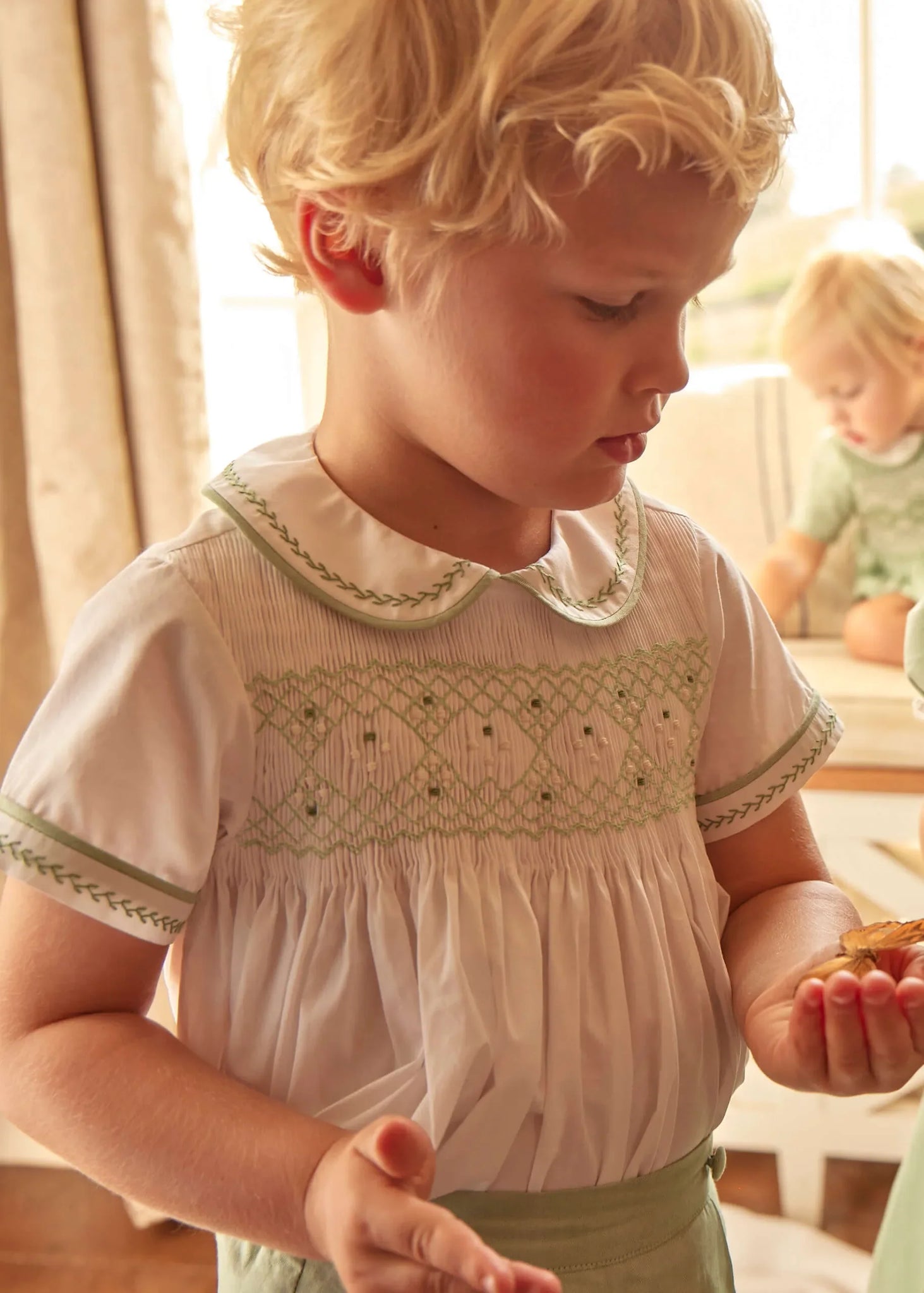 Designed with the utmost attention to detail, this hand smocked Two Piece Set is not just a garment; it's an heirloom piece that can be passed down through generations. The top and short set allow for easy outfit building that is both smart and sophisticated. It has a classic Peter Pan collar and short sleeves, made for special occasions.