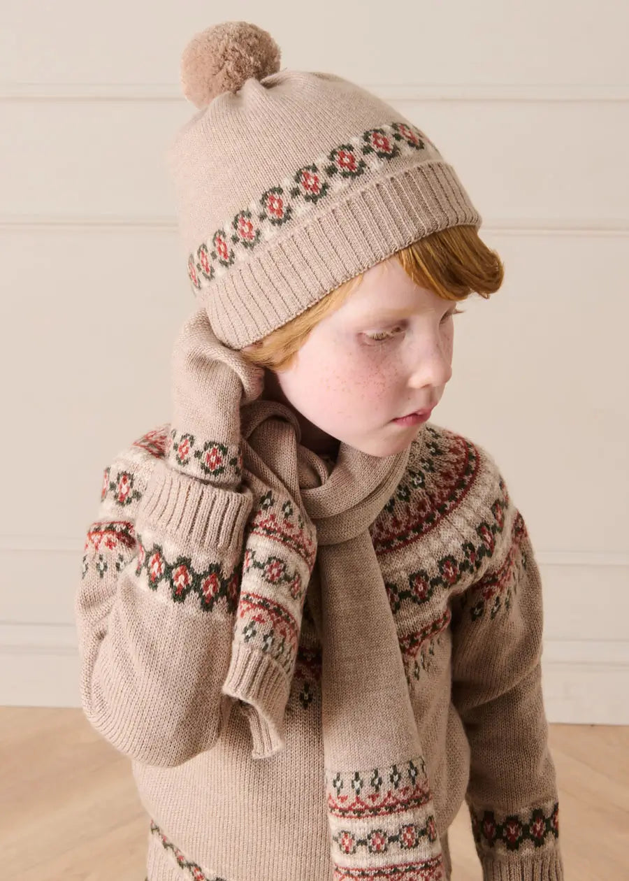 The Fair Isle Knitted Scarf in Camel is crafted from 100% wool, providing gentle warmth and comfort throughout the colder months. Featuring a classic Fair Isle pattern in warm camel tones, this scarf pairs beautifully with the matching pom pom hat, making it an elegant and cosy addition to your child's winter wardrobe.