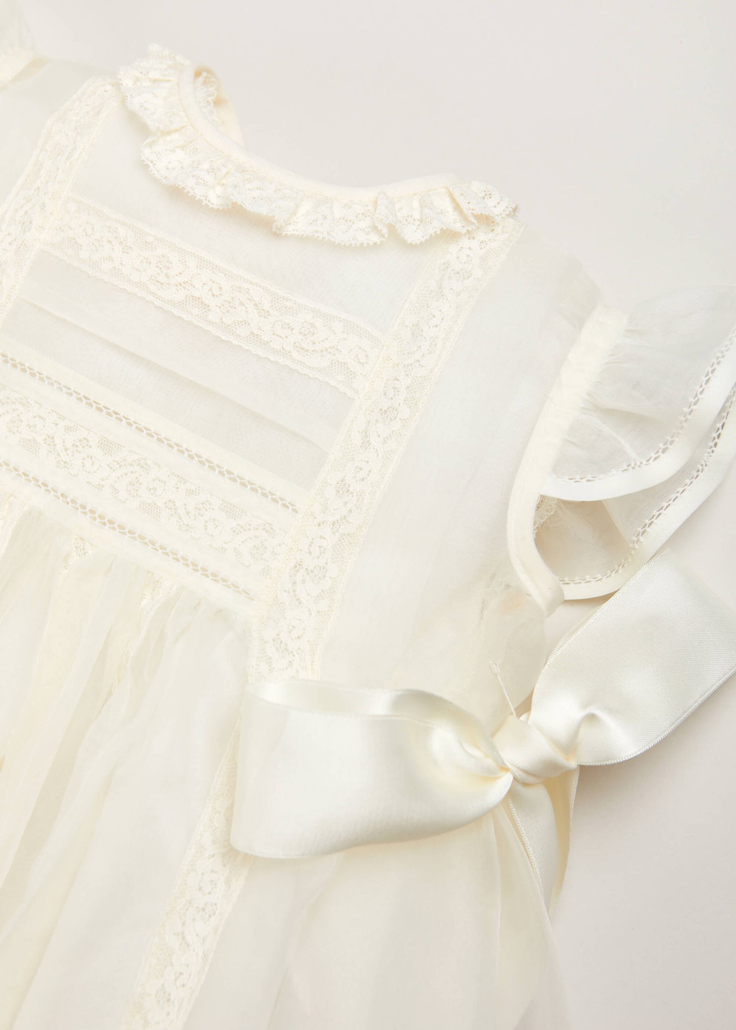 This traditional christening gown is perfect to be kept as a family heirloom and handed down to future generations. In an elegant neutral cream colour, this design features frill detailing, panelling across the chest and plumeti skirt overlay.