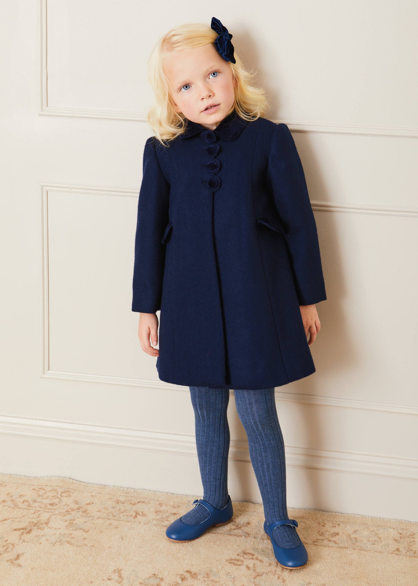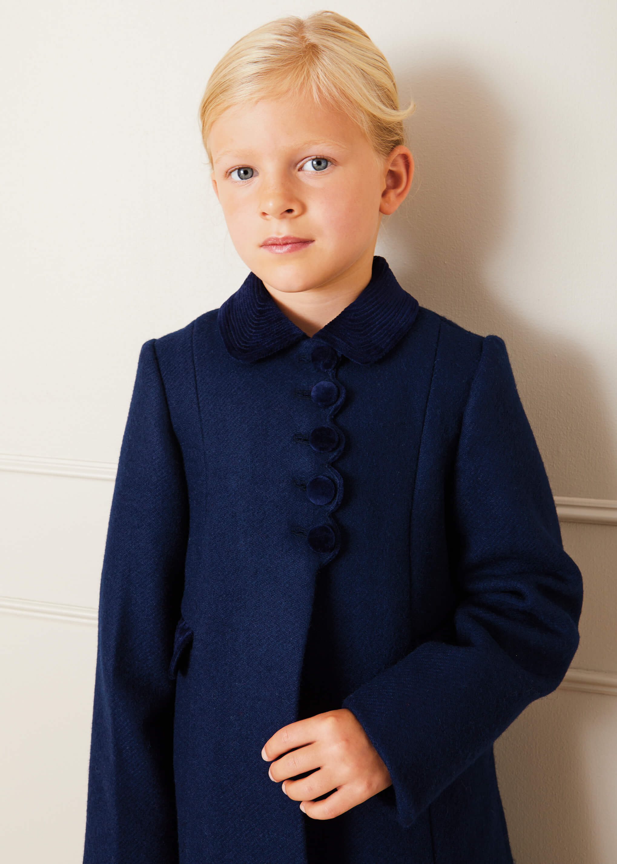 Made from 100% premium wool, this Traditional Single Breasted Coat is crafted in a luxe navy. It features a delicate scallop trim and functioning buttons down the front. An essential item for layering.