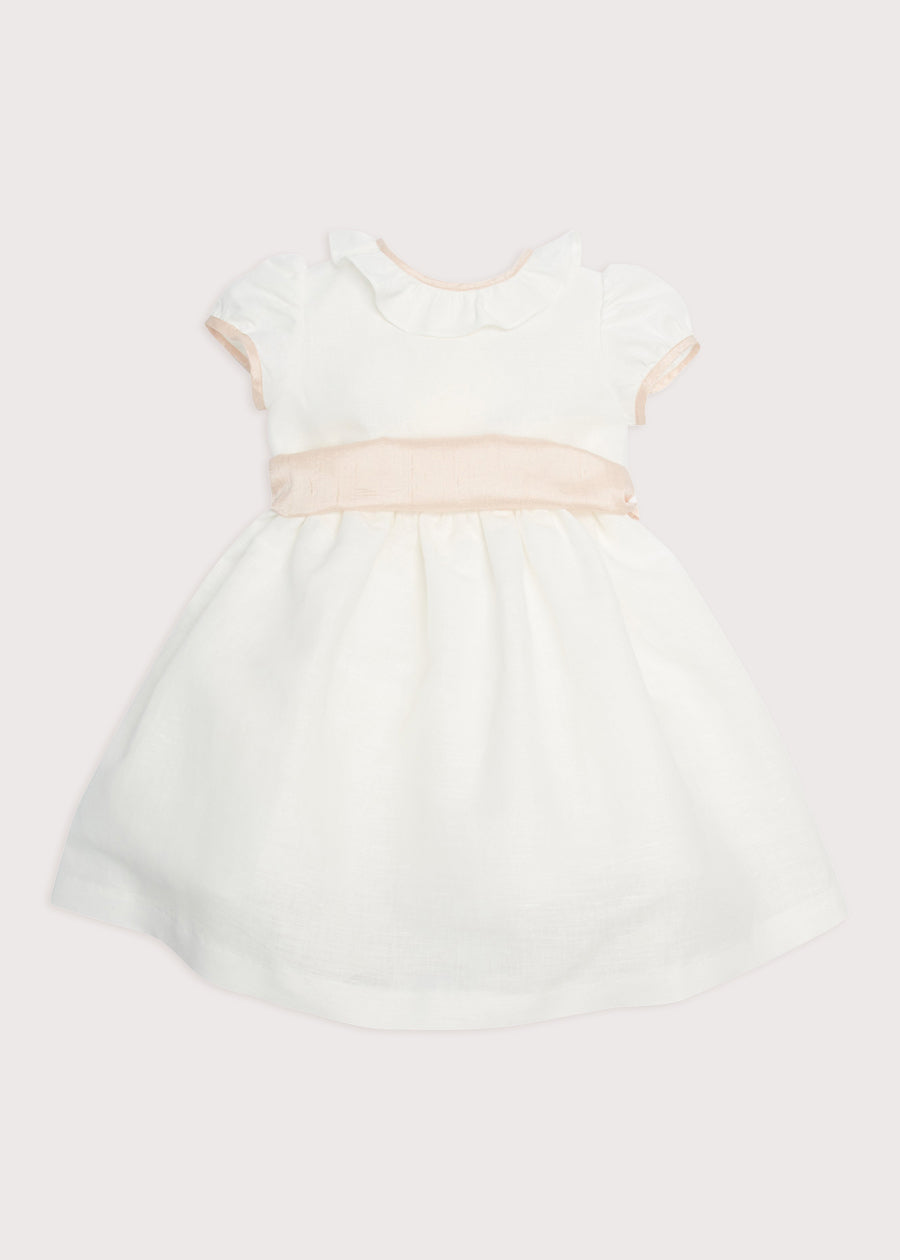 Wonderfully full-shaped celebration dress made from a very soft mix of linen and cotton with short puffed sleeves, and finished with a frill collar. Contrasting beautiful pink trims on neckline and balloon shape sleeves as well as an elegant silk dupion sash that finishes in a bow at the waist and matches the front. The back of the dress features three covered buttons and a belt loop to keep the sash in place. The over-the-knee length skirt comes with petticoats underneath to provide a voluminous and sophisticated shape. A very delicate garment to be worn on special occasions such as weddings, this is ideal for flower girls and little bridesmaids.