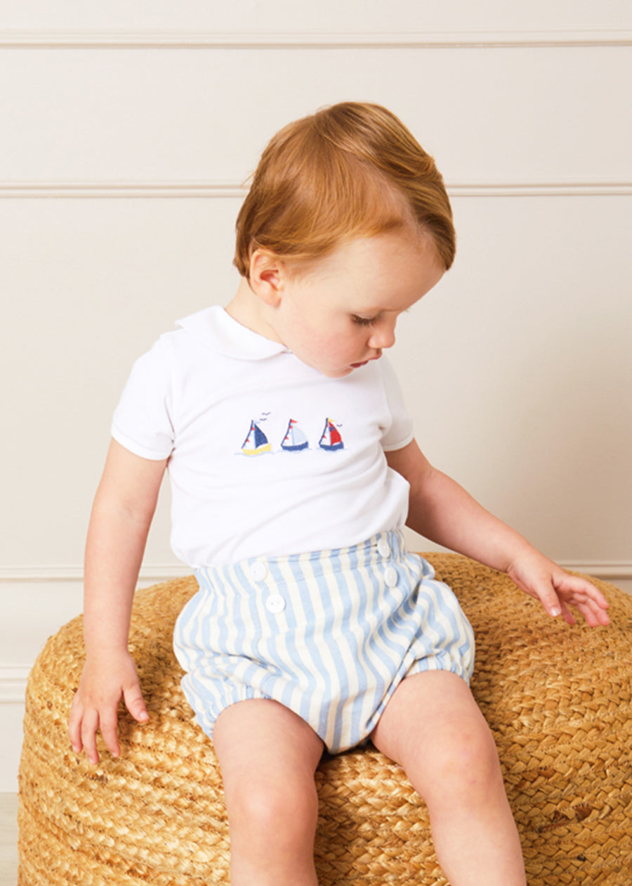 An essential garment to have in your baby's wardrobe, this Peter Pan Short Sleeve Bodysuit is traditional and timeless. It has a classic Peter Pan collar that features a sweet three sail boat embroidery on the front. Includes popper fastenings between the legs for easy changing.