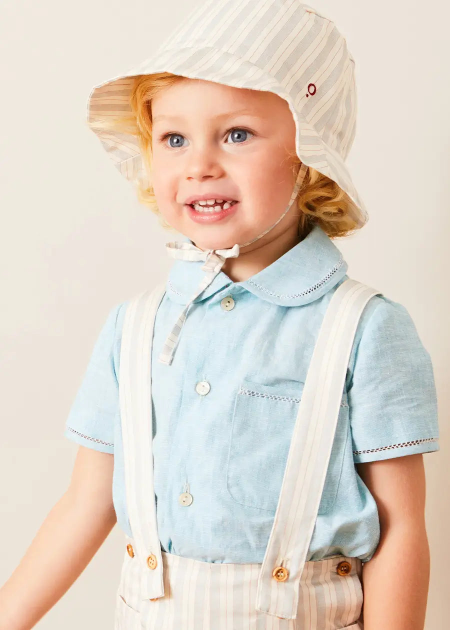 This blue shirt is crafted from 100% cotton, ensuring softness and comfort for your little one. Featuring a classic Peter Pan collar and delicate trim detail, it adds a refined touch to everyday wear. The short sleeves and breathable fabric make it perfect for warmer days, offering both ease and style for your baby or child. Ideal for dressing up or down, this shirt pairs effortlessly with a range of outfits.