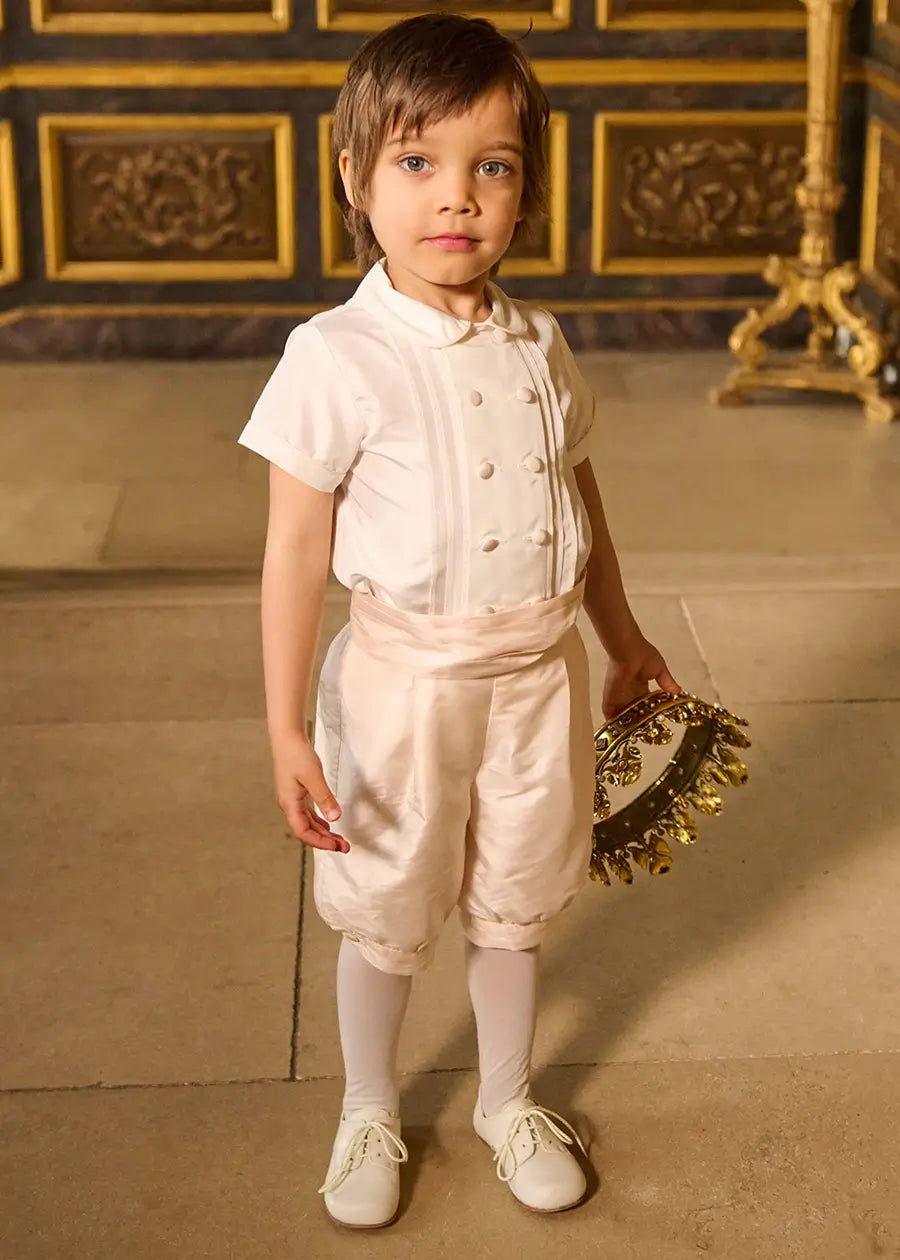 This heirloom-worthy three-piece set includes a silk shirt, silk knickerbockers, and a matching silk cummerbund.The shirt is detailed with 10 silk-covered buttons framed by parallel pleats, a charming Peter Pan collar, and rose silk piping along the collar and sleeve cuffs for a refined finish. Two buttons at the waistband secure the knickerbockers in place for a tailored fit.