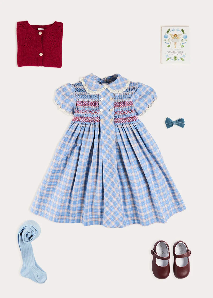 A nod to vintage school-day charm, The Denby Check Dress blends classic tailoring with thoughtful craftsmanship. Featuring a hand-smocked front bodice with intricate burgundy contrast stitching, this dress channels heritage style in a timeless silhouette. The bespoke blue check is framed with a Peter Pan collar trimmed in delicate lace, while short gathered sleeves and a double-breasted button front add refined detail. A soft cotton petticoat layered underneath offers subtle volume and comfort, perfect for the new season’s outings or picture-perfect moments.