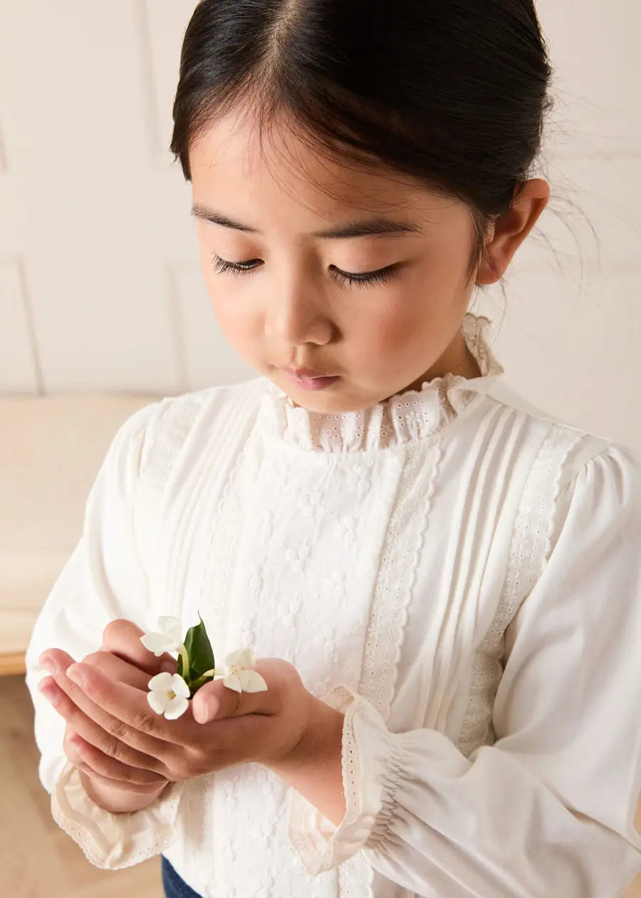 Delicate charm meets timeless elegance in the Flower Embroidered Lace Detail Top with long sleeves, designed for little girls who love subtle sophistication. Crafted from soft fabric, it features exquisite white embroidered anglaise lace with scalloped edges and intricate floral embroidery down the front. The high neckline is finished with pleated panelling, adding classic texture and refined detail.