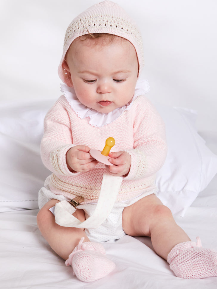 It is important to consider easy changing on a wriggling baby, and therefore, garments with easy poppers and comfortable pull-overs are key. Babies will also start to wear shoes. Pram shoes are perfect for a little one finding their feet from crawling and walking. Our Baby Shoes are ideal for more confident walkers that have a rubber sole. Discover our Shoe Guide here.