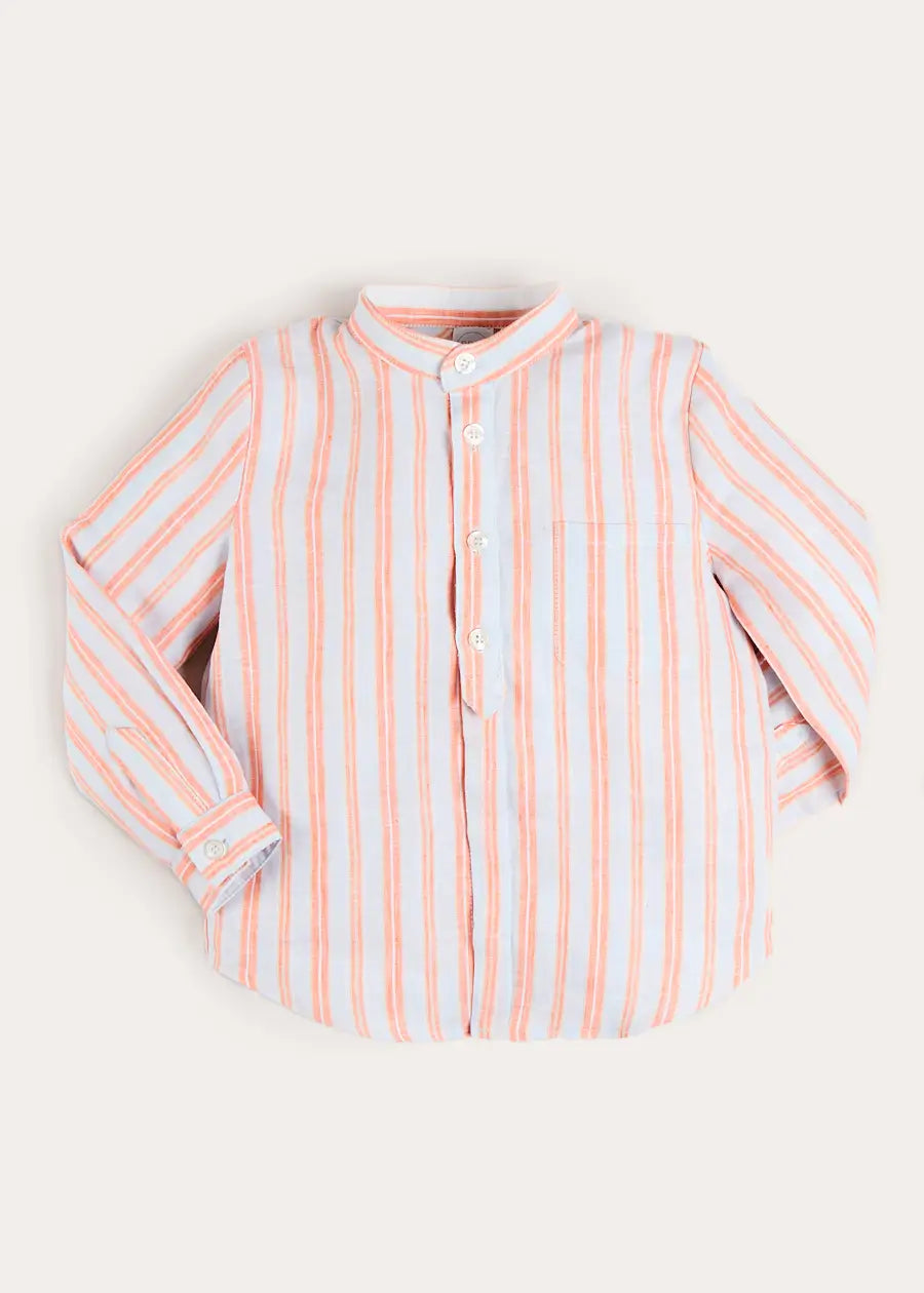 The August Stripe Mao Collar Shirt in Orange is a timeless piece for little gents, crafted with Pepa London’s signature luxury and attention to detail. Made from 100% breathable linen, this long-sleeved shirt features a classic Mao collar, bespoke August stripe design, and buttons down the front for easy dressing. Its tailored silhouette and vibrant orange hue combine comfort with refined elegance, making it a versatile choice for both special occasions and elevated everyday style.
