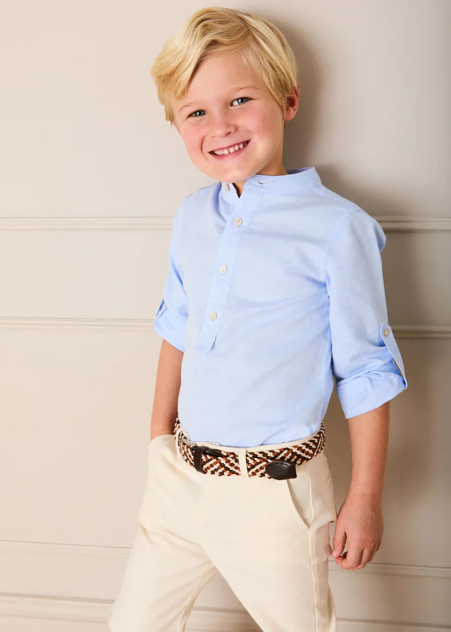 The Mao Collar Linen Blend Shirt in Blue is a refined and versatile piece for children, crafted with Pepa London’s signature attention to detail. Made from a premium 55% organic cotton and 45% linen blend, it features a classic Mao collar, long sleeves, and a button-down front, offering a timeless silhouette with effortless comfort. This luxury children’s shirt blends elegance, breathable fabrics, and subtle sophistication, making it a wardrobe staple for both everyday wear and special occasions.