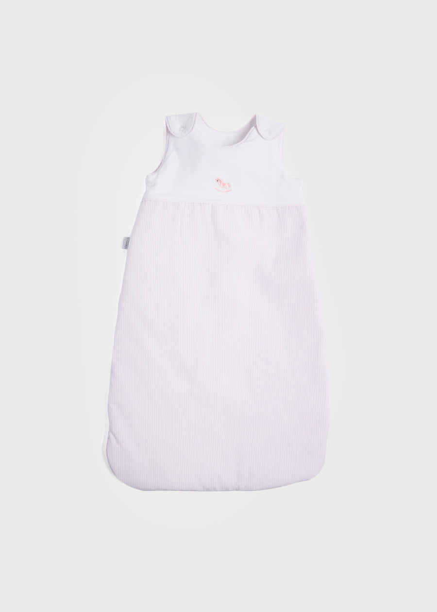 This 2.5 tog sleeping bag is cosy and soft with rocking horse embroidery on the front. Made from cotton, this sleeping bag has a delicate pale pink striped woven design around the bottom half with a soft white jersey top. Snap button fastenings are placed on the shoulders for an easy and dreamless sleep for your little one.