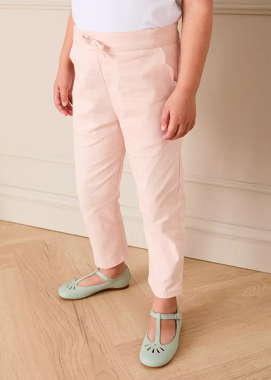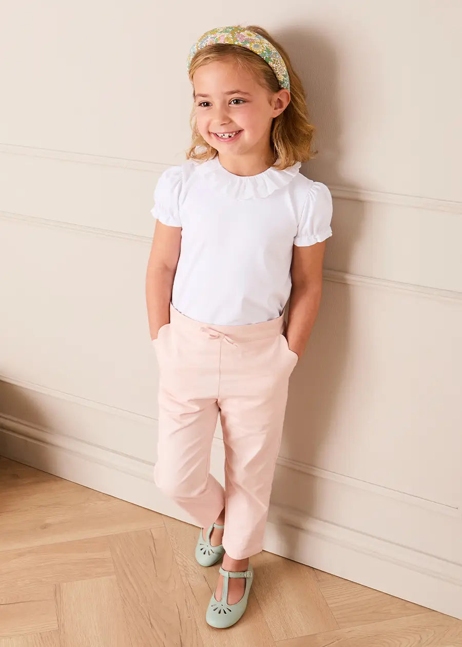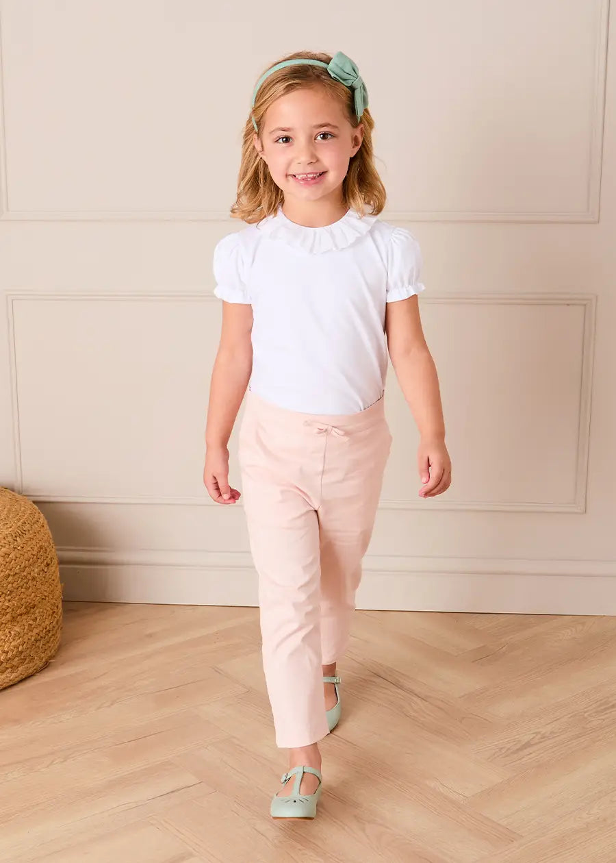 The Scallop Edged Pocket Bow Detail Trousers in Baby Pink are a charming and elegant addition to a little girl’s wardrobe, crafted with Pepa London’s signature attention to detail. Featuring scallop-edged front pockets, a delicate bow at the waistband, and an elasticated back for comfort, these luxury children’s trousers combine refined design with practicality. The slim fit and soft baby pink hue, inspired by the freshness of spring, make them perfect for everyday wear or special occasions.