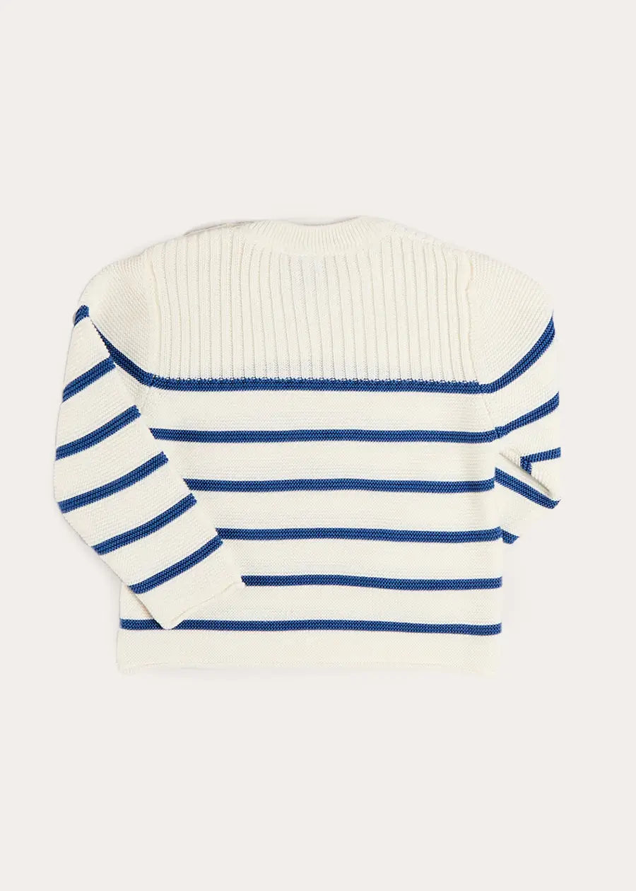 The Striped Crewneck Jumper in Navy is a timeless British-style knit for boys, crafted from 100% soft cotton with Pepa London’s signature attention to detail. Featuring classic navy and white nautical stripes, a crewneck with ribbed detailing, and buttons on the shoulders for easy dressing, this luxury children’s jumper combines comfort with refined design. With long sleeves and a versatile fit, it is perfect for layering or wearing on its own.