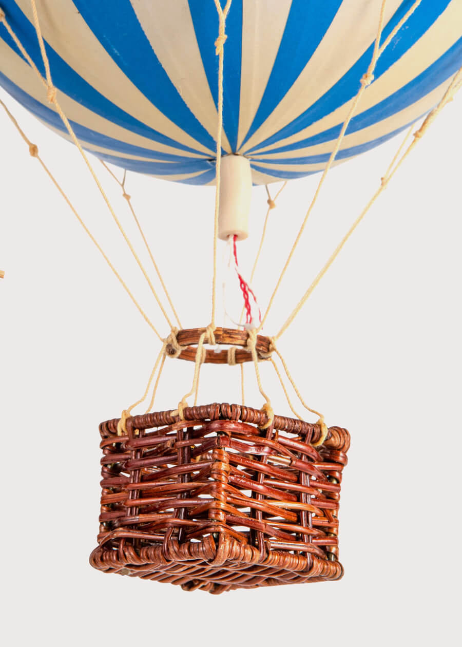 Hang a touch of magic into your little ones nursery or bedroom. This Blue Striped Hot Air Balloon ornament has been made from a combination of rattan and paper and is hung by knotted netting, rope and wooden toggle, adding a sweet whimsical charm to any room.