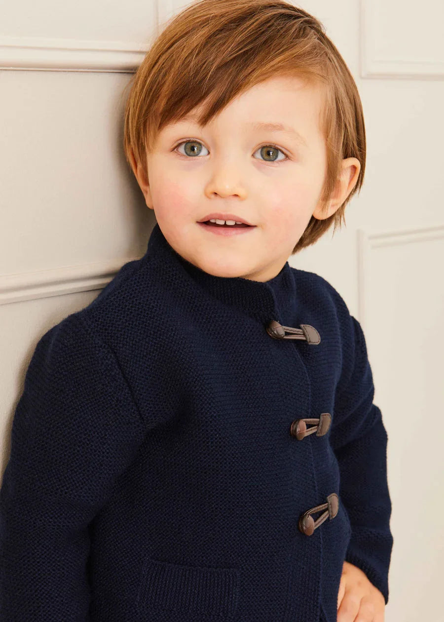 Discover comfort and style with our Navy Knitted Cardigan. This cozy essential boasts long sleeves, two front pockets, and a classic brown toggle fastening. Crafted from a soft wool blend ideal for sensitive skin, it offers extra warmth for cooler months. Elevate your wardrobe with this must-have layer of comfort today.