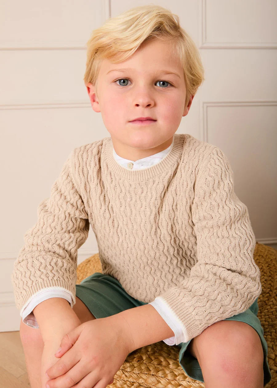 The Wave Knit Jumper in Beige is a timeless layering piece for boys, designed with Pepa London’s signature understated elegance. Crafted in a classic wave knit style with long sleeves, this luxury children’s jumper is perfect for lightweight layering during summer or transitional weather. Its versatile design makes it a timeless and practical wardrobe staple, ideal for pairing with shorts, trousers, or chinos for effortless everyday or smart-casual outfits. A refined and enduring piece that brings comfort, style, and understated sophistication to boys’ wardrobes.